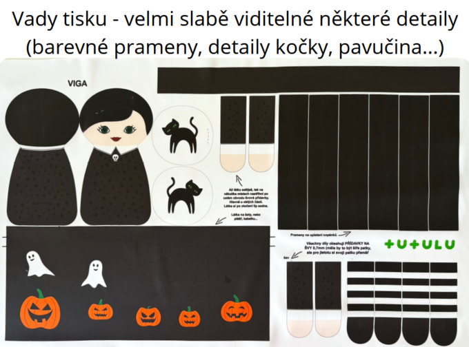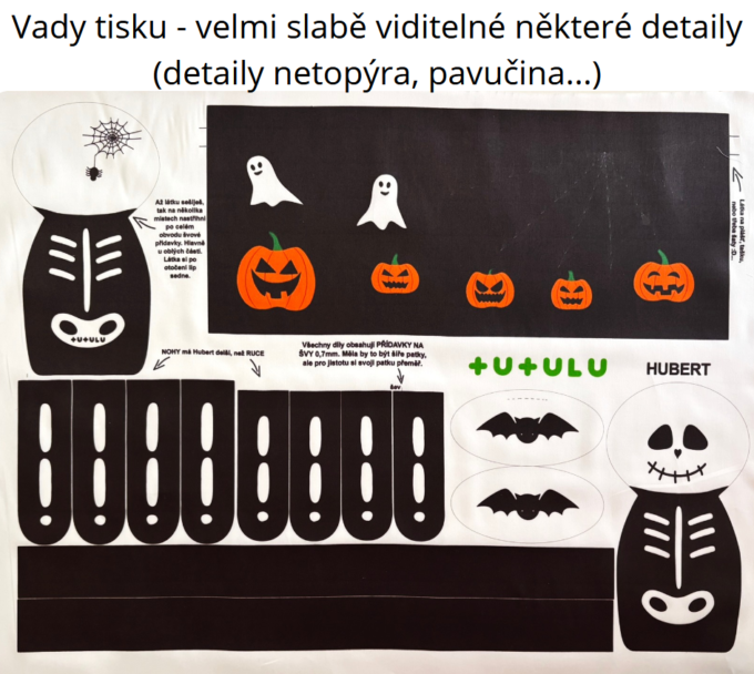 Pozor, tohle je speciální strašidelná edice se strašlivou tiskovou vadou – černá se při tisku rozpila a pohltila detaily jiné barvy (jestli tohle nejsou čáry a kouzla, tak teda nevím) – viz. foto. Skvělá šance ušít originální strašidla s vadou, která se (doufám) nebude opakovat, za parádní cenu!