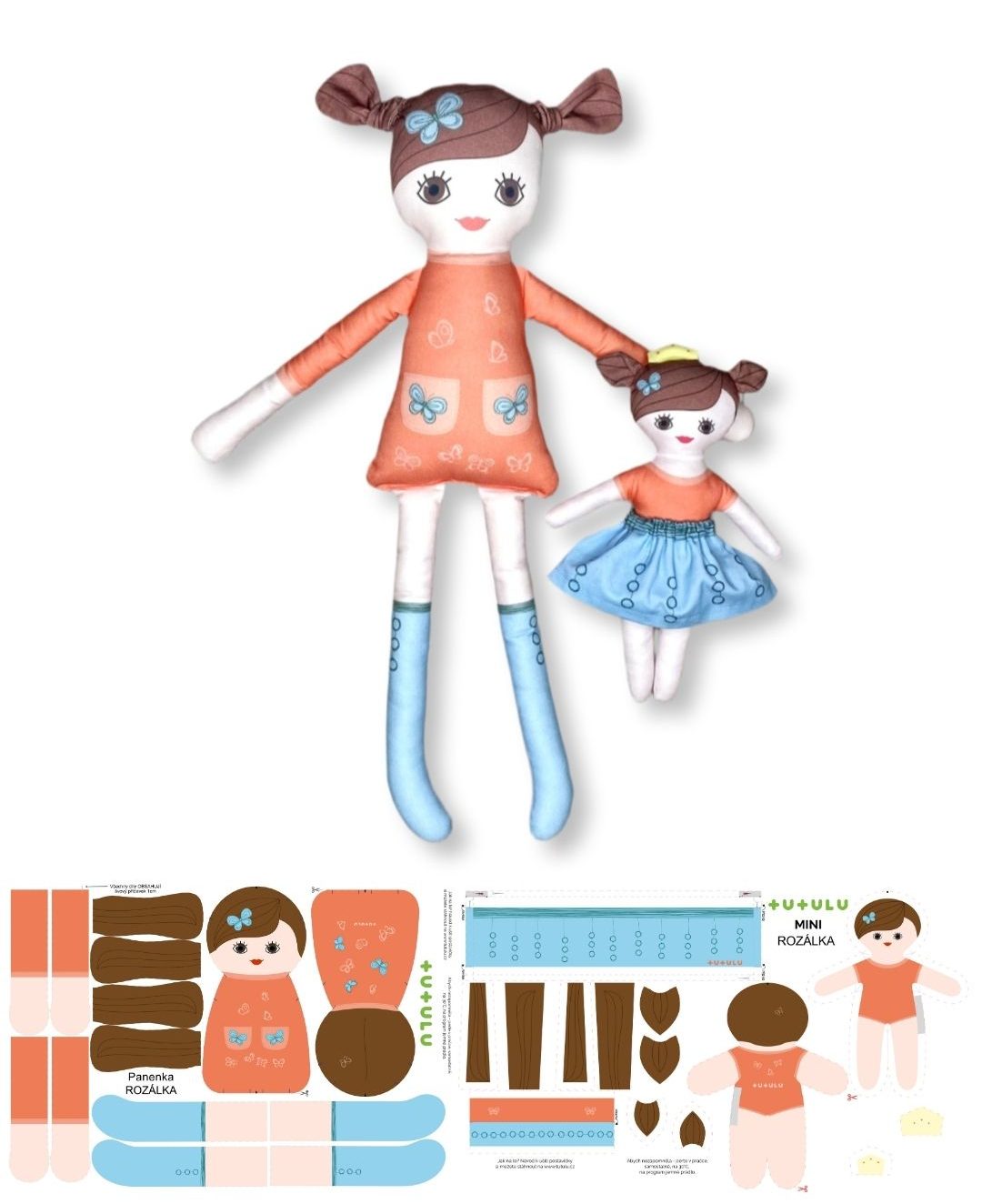 Hnědé vlasy, červeno-oranžové šaty s motýlky a modrými botičkami. Panel na látkovou panenku velká + mini v jednom setu (50 cm + 25 cm).